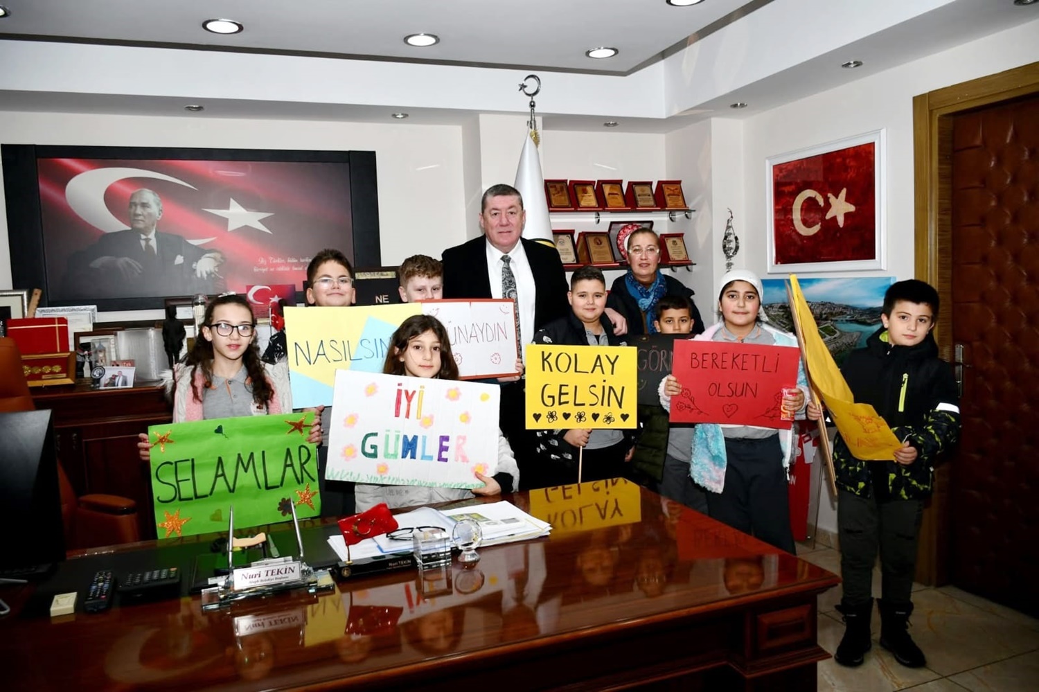 Milli Eğitim Bakanlığı’nın “Türkiye Selamlaşıyor” projesi kapsamında Alaplı Atatürk İlkokulu 4/C sınıfı öğrencileri, Alaplı Belediye Başkanı Nuri Tekin’i ziyaret ederek iyi dileklerde bulundular.